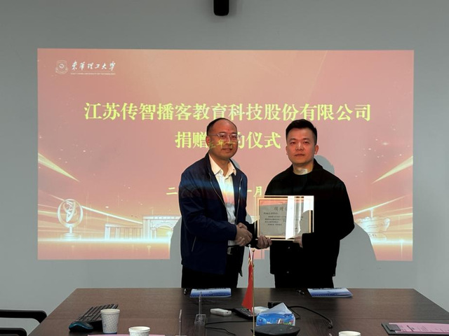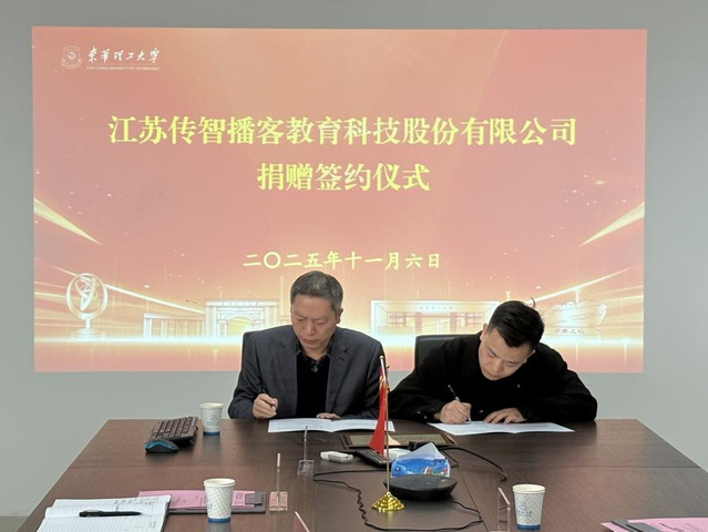 2025年11月6日上午,江苏传智播客教育科技股份有限公司捐赠签约仪式在软件学院国防科技大楼1114会议室举行。传智教育院校市场部总监翁发达一行4人,软件学院党委书记江雁飞、院长李祥、学院班子成员及师生代表共同见证仪式,仪式由学院党委副书记司红伟主持。