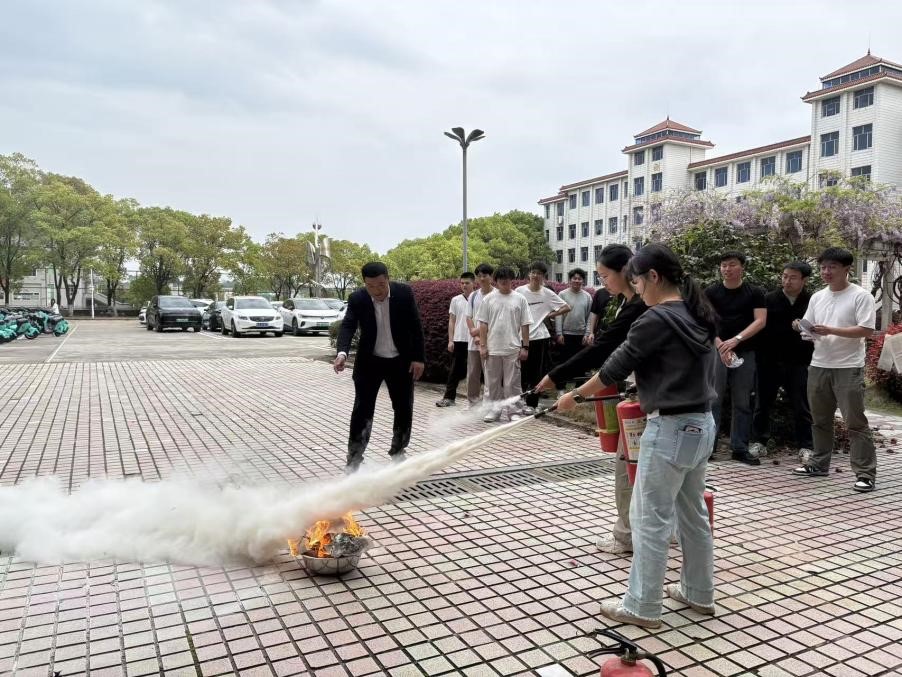 培训后,师生移步户外开展灭火器实操演练,谌巍老师现场演示操作细节,同学们分组规范完成灭火实操。